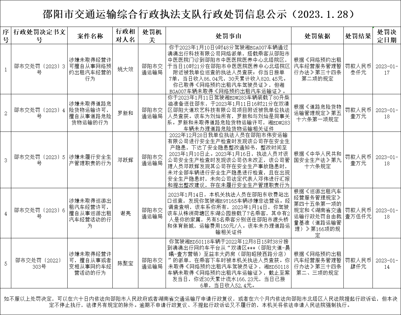 邵阳市交通运输综合行政执法支队行政处罚信息公示(2023.1.28)
